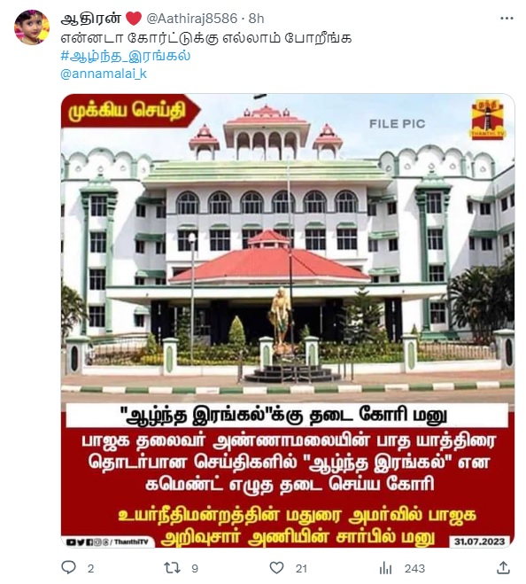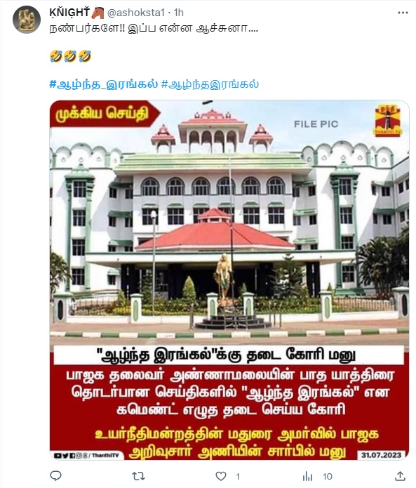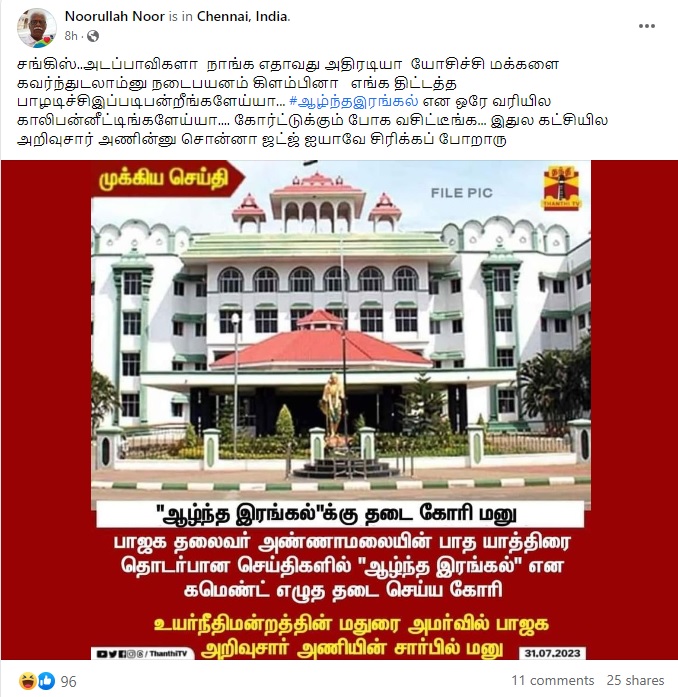 “ஆழ்ந்த இரங்கல்-க்கு தடை கோரி மனு. பாஜக தலைவர் அண்ணாமலையின் பாத யாத்திரை தொடர்பான செய்திகளில் “ஆழ்ந்த இரங்கல்” என கமெண்ட் எழுத தடை செய்ய கோரி உயர்நீதிமன்றத்தின் மதுரை அமர்வில் பாஜக அறிவுசார் அணியின் சார்பில் மனு” என்று இந்த நியூஸ்கார்ட் பரவி வருகிறது.