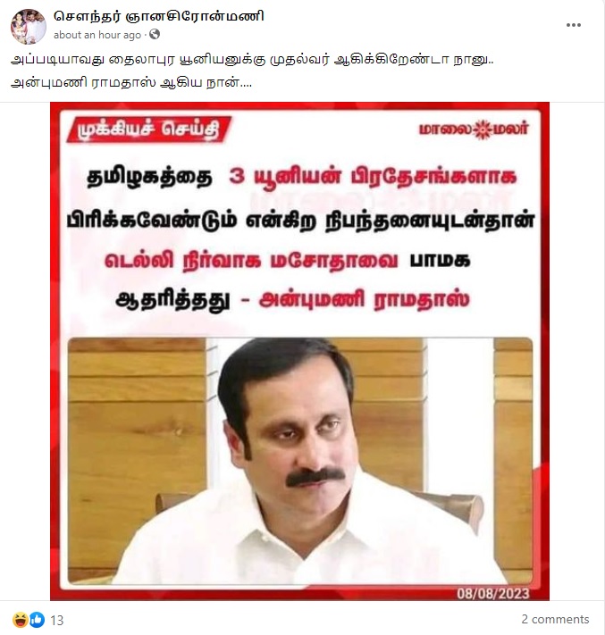 தமிழகத்தை மூன்று யூனியன் பிரதேசங்களாகப் பிரிக்கும் கோரிக்கையுடனேயே டெல்லி நிர்வாக மசோதாவை ஆதரித்தோம் என்று பாமக தலைவர் அன்புமணி ராமதாஸ் கூறியதாக நியூஸ்கார்ட் ஒன்று பரவி வருகிறது.