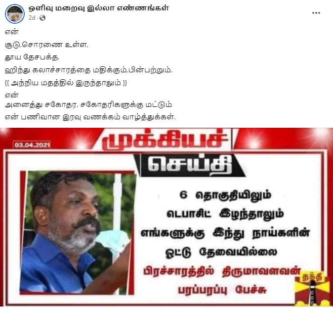 Facebook Post from Thanthi Tv, Dated April 04, 2021