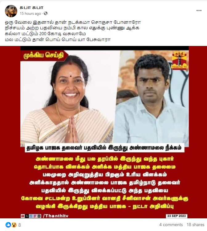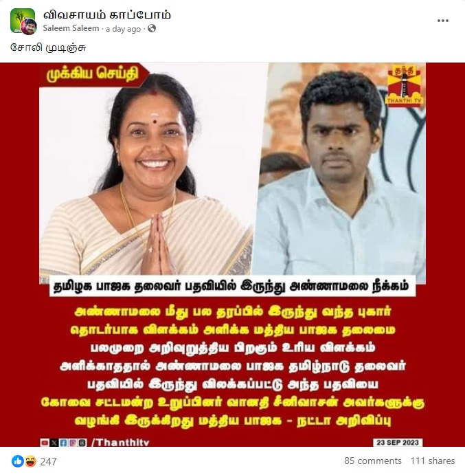 ”தமிழக பாஜக தலைவர் பதவியில் இருந்து அண்ணாமலை நீக்கம். அண்ணாமலை மீது பல தரப்பில் இருந்து வந்த புகார் தொடர்பாக விளக்கம் அளிக்க மத்திய பாஜக தலைமை பலமுறை அறிவுறுத்திய பிறகும் உரிய விளக்கம் அளிக்காததால் அண்ணாமலை பாஜக தமிழ்நாடு தலைவர் பதவியில் இருந்து விலக்கப்பட்டு அந்த பதவியை கோவை சட்டமன்ற உறுப்பினர் வானதி சீனிவாசன் அவர்களுக்கு வழங்கி இருக்கிறது மத்திய பாஜக – நட்டா அறிவிப்பு” என்று இந்த நியூஸ்கார்ட் வைரலாகிறது.