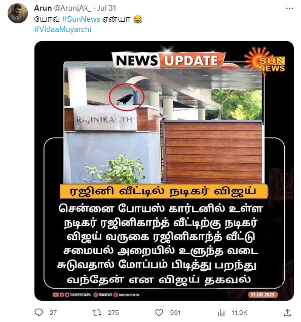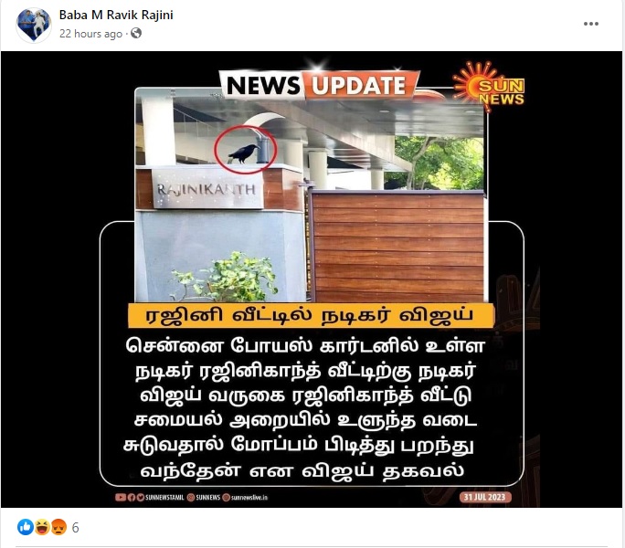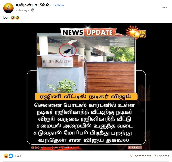 “ரஜினி வீட்டில் நடிகர் விஜய். சென்னை போயஸ் கார்டனில் உள்ள நடிகர் ரஜினிகாந்த் வீட்டிற்கு நடிகர் விஜய் வருகை ரஜினிகாந்த் வீட்டு சமையல் அறையில் உளுந்த வடை சுடுவதால் மோப்பம் பிடித்து பறந்து வந்தேன் என விஜய் தகவல்” என்று இந்த நியூஸ்கார்ட் பரவி வருகிறது.