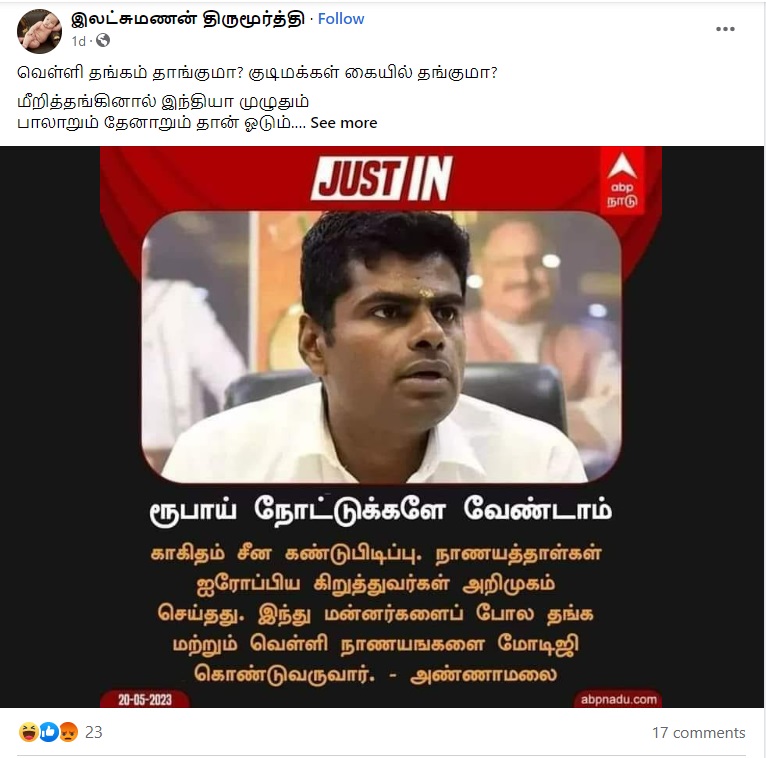 “ரூபாய் நோட்டுக்களே வேண்டாம் காகிதம் சீன கண்டுபிடிப்பு. நாணயத்தாள்கள் ஐரோப்பிய கிறுத்துவர்கள் அறிமுகம் செய்தது. இந்து மன்னர்களைப் போல தங்க மற்றும் வெள்ளி நாணயங்களை மோடிஜி கொண்டு வருவார். – அண்ணாமலை” என்று அந்த நியூஸ்கார்ட் வைரலாகி வருகிறது.