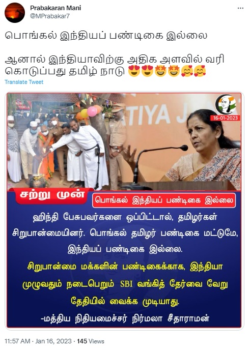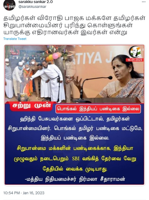 “பொங்கல் இந்தியப் பண்டிகை இல்லை. ஹிந்தி பேசுபவர்களை ஒப்பிட்டால் தமிழர்கள் சிறுபான்மையினர். பொங்கல் தமிழர் பண்டிகை மட்டுமே. இந்தியப் பண்டிகை இல்லை. சிறுபான்மை மக்களின் பண்டிகைக்காக இந்தியா முழுவதும் நடைபெறும் SBI வங்கித் தேர்வை வேறு தேதியில் வைக்க முடியாது” என்று ஒன்றிய நிதியமைச்சர் நிர்மலா சீதாராமன் கூறியதாக அந்த நியூஸ்கார்ட் வைரலாகிறது.