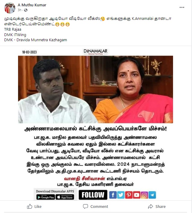 “அண்ணாமலையால் கட்சிக்கு அவப்பெயர்களே மிச்சம். பாஜக மாநில தலைவர் பதவியிலிருந்து அண்ணாமலை விலகினாலும் கவலை ஏதும் இல்லை. கட்சிக்காரர்களை வேவு பார்ப்பது, ஆடியோ, வீடியோ லீக்ஸ் என கட்சிக்கு அவரால் உண்டான அவப்பெயரே மிச்சம். அண்ணாமலையால் கட்சி இங்கு ஒரு அங்குலம் கூட வளரவில்லை. 2024 நாடாளுமன்றத் தேர்தலிலும் அதிமுகவுடனான கூட்டணி நிச்சயம் தொடரும். வானதி சீனிவாசன், எம்.எல்.ஏ, பாஜக தேசிய மகளிரணி தலைவர்” என்பதாக இந்த நியூஸ்கார்ட் வைரலாகிறது.