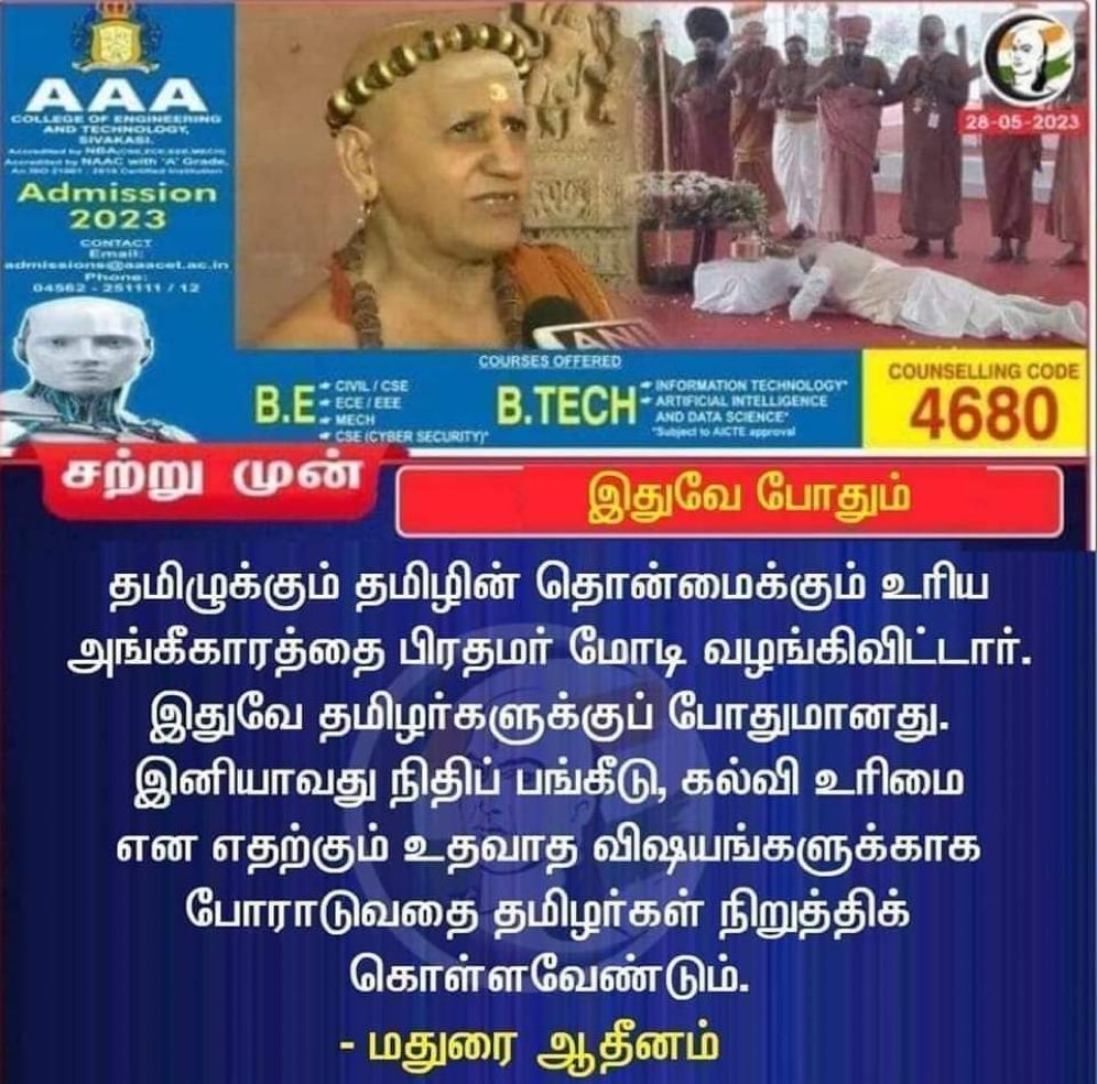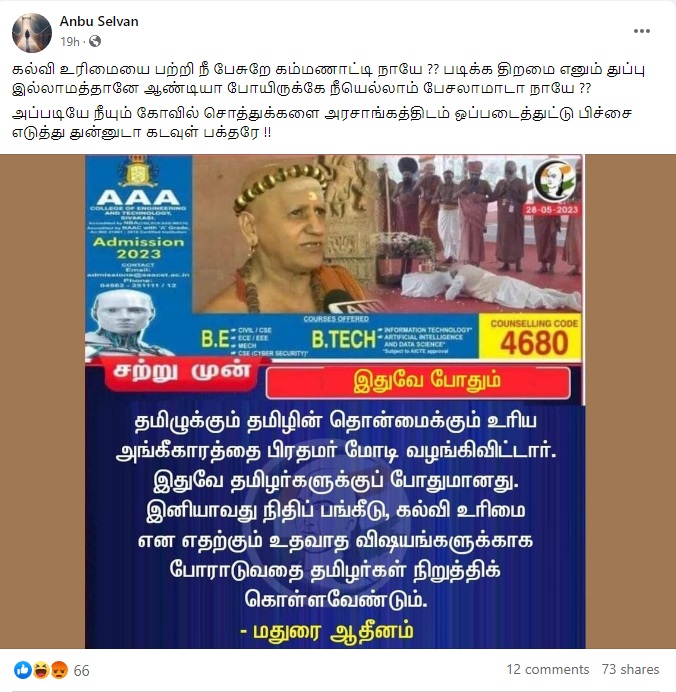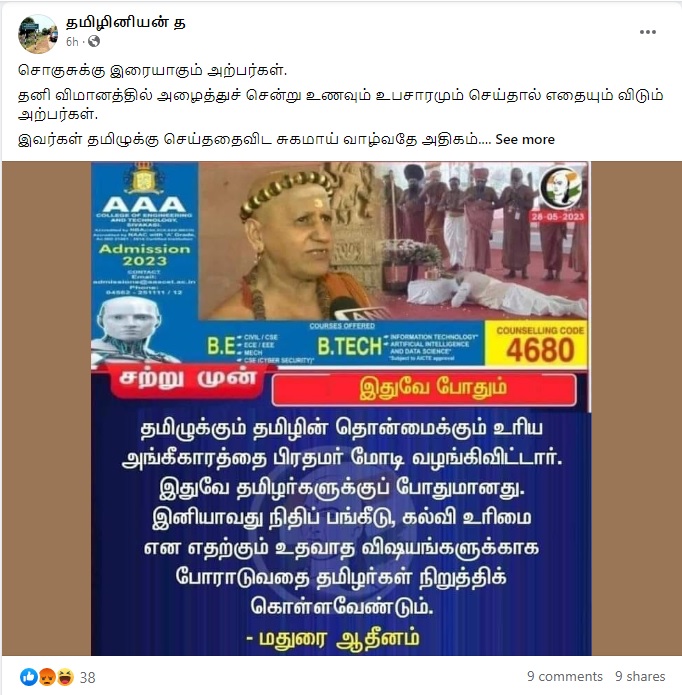 “தமிழுக்கும் தமிழின் தொன்மைக்கும் உரிய அங்கீகாரத்தை பிரதமர் மோடி வழங்கிவிட்டார். இதுவே தமிழர்களுக்குப் போதுமானது. இனியாவது நிதிப் பங்கீடு, கல்வி உரிமை என எதற்கும் உதவாத விஷயங்களுக்காக போராடுவதை தமிழர்கள் நிறுத்திக் கொள்ளவேண்டும் – மதுரை ஆதீனம்” என்று அந்த நியூஸ்கார்ட் பரவி வருகிறது.