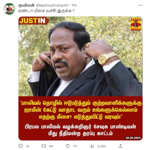 இந்நிலையில் தற்போது, ”பாலியல் தொழிலில் ஈடுபடுத்தும் குற்றவாளிகளுக்கு ஜாமீன் கேட்டு வாதாட வரும் உங்களுக்கெல்லாம் எதற்கு மீசை? எடுத்துவிட்டு வரவும்” என்று நீதிமன்ற தரப்பு, நிர்மலா தேவியின் வழக்கறிஞர் பசும்பொன் பாண்டியனை கேள்வி கேட்டதாக அந்த நியூஸ் கார்ட் பரவுகிறது.