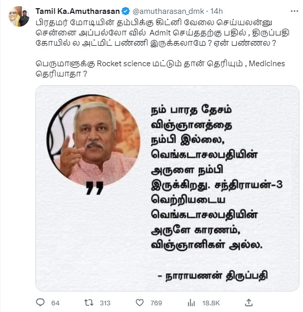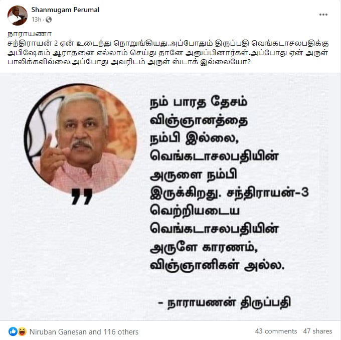 “நம் பாரத தேசம் விஞ்ஞானத்தை நம்பி இல்லை, வெங்கடாசலபதியின் அருளை நம்பி இருக்கிறது. சந்திரயான்-3 வெற்றியடைய வெங்கடாசலபதியின் அருளே காரணம், விஞ்ஞானிகள் அல்ல- நாராயணன் திருப்பதி” என்று இந்த நியூஸ்கார்ட் பரவுகிறது.