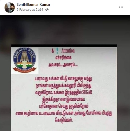 அவ்வகையில், தமிழ்நாடு காவல்துறை அறிவிப்பு என்பதாக, “அவசரம்…அவசரம். யாராவது உங்கள் வீட்டு வாசலுக்கு வந்து நாங்கள் மருத்துவக் கல்லூரியிலிருந்து வருகிறோம். உங்கள் இரத்தத்தில் சர்க்கரை இருக்கிறதா என இலவசமாகப் பரிசோதனை செய்து தருகின்றோம் எனக் கூறினால் உடனடியாக விரட்டுங்கள் அல்லது போலீஸில் பிடித்துக் கொடுங்கள்.