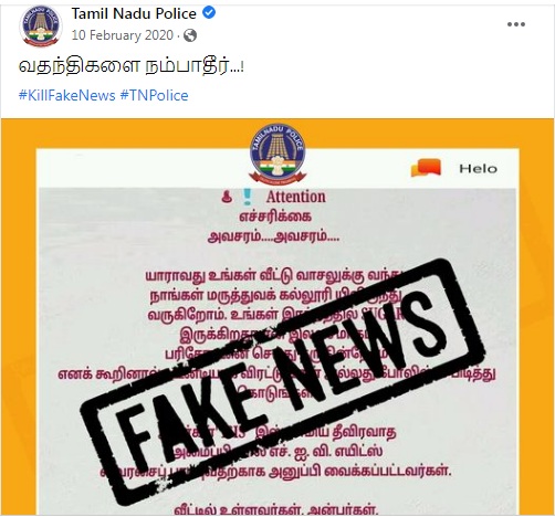 தொடர்ந்து, தமிழக காவல்துறையின் அதிகாரப்பூர்வ சமூக வலைத்தளங்களில் ஆராய்ந்தபோது அவர்களது அதிகாரப்பூர்வ பேஸ்புக் பக்கத்தில் “வதந்திகளை நம்பாதீர்” என்று குறிப்பிட்ட செய்தி போலியானது என்பதாக கடந்த 2020 ஆம் ஆண்டு, பிப்ரவரி 10 ஆம் தேதியன்று பதிவிட்டுள்ளனர்.