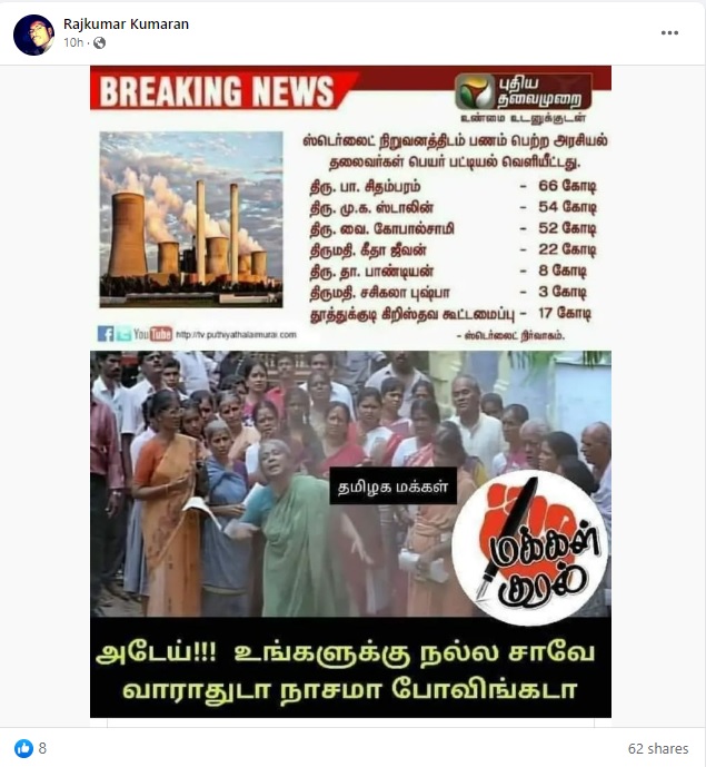 ஸ்டெர்லைட் ஆலை நிர்வாகத்திடம் பணம் பெற்ற அரசியல் தலைவர்கள் என்று நியூஸ்கார்ட் ஒன்று சமூக வலைத்தளங்களில் பரவி வருகிறது.