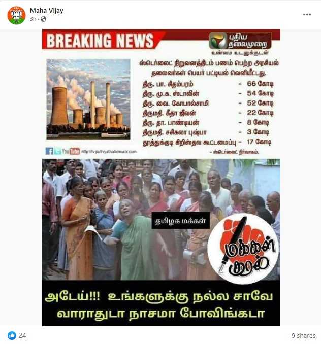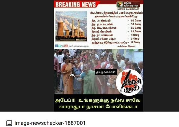 ஸ்டெர்லைட் ஆலை நிர்வாகத்திடம் பணம் பெற்ற அரசியல் தலைவர்கள் என்று பரவுகின்ற நியூஸ்கார்ட் போலியானது என்பது நமக்கு கிடைத்த ஆதாரங்களின் வாயிலாக தெளிவாகியுள்ளது.