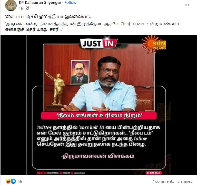 விடுதலைச்சிறுத்தைகள் கட்சித்தலைவர் தொல்.திருமாவளவன், நீலம் எங்கள் உரிமை நிறம் என்றதாகவும், குறிப்பிட்ட ஒரு ட்விட்டர் பக்கத்தை நீலம் என்கிற ஒரே காரணத்திற்காக தொடர்ந்தேன் என்று கூறியதாகவும் நியூஸ்கார்ட் ஒன்று சமூக வலைத்தளங்களில் வைரலாகிறது.