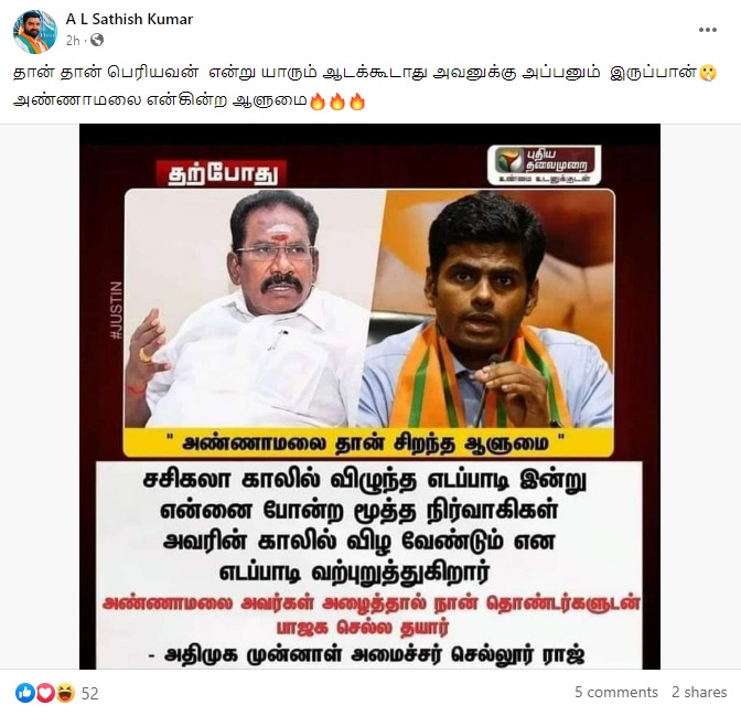அண்ணாமலைதான் சிறந்த ஆளுமை என்று முன்னாள் அதிமுக அமைச்சர் செல்லூர் ராஜூ கூறியதாக நியூஸ்கார்ட் ஒன்று சமூக வலைத்தளங்களில் பரவி வருகிறது.