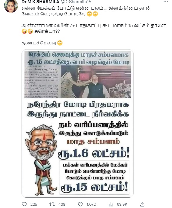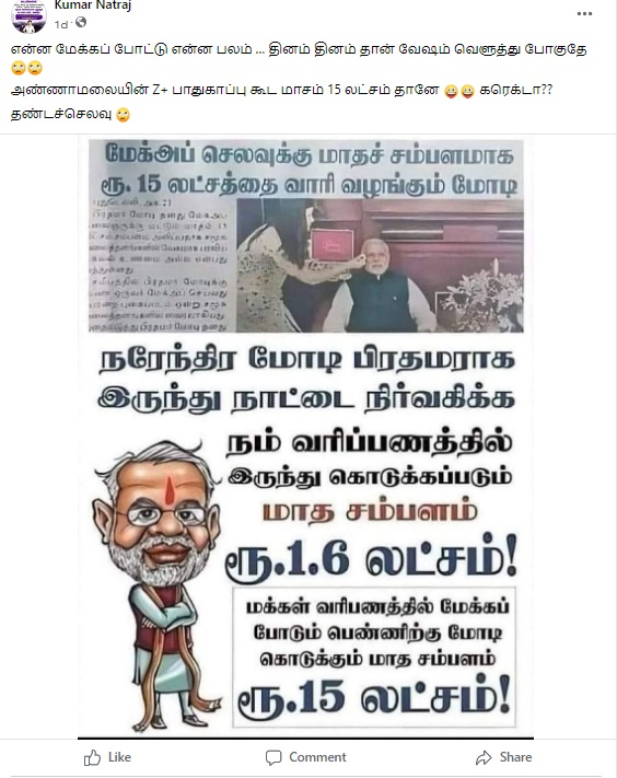 “நரேந்திர மோடி பிரதமராக இருந்து நாட்டை நிர்வகிக்க நம் வரிப்பணத்தில் இருந்து கொடுக்கப்படும் மாத சம்பளம் ரூ.1.6 லட்சம். மக்கள் வரிப்பணத்தில் மேக்கப் போடும் பெண்ணிற்கு மோடி கொடுக்கும் மாத சம்பளம் ரூ.15 லட்சம்” என்பதாக இந்த புகைப்படம் சமூக வலைத்தளங்களில் பரவுகிறது.