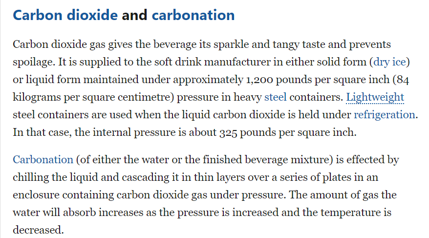 குளிர்பானங்களில் உள்ள கார்போனிக் அமிலம், குளிர்பான பாட்டிலை திறந்தவுடனேயே சிதைந்துவிடும் என்று பிரிட்டானிகாவின் கட்டுரையில் தெரிவிக்கப்பட்டுள்ளது.