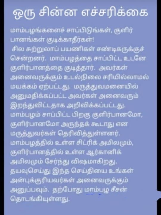 ”ஒரு சின்ன எச்சரிக்கை மாம்பழங்களைச் சாப்பிடுங்கள், குளிர் பானங்கள் குடிக்காதீர்கள்! சில சுற்றுலாப் பயணிகள் சண்டிகருக்குச் சென்றனர். மாம்பழத்தை சாப்பிட்ட உடனே குளிர்பானத்தை குடித்தார். அவர்கள் அனைவருக்கும் உடல்நிலை சரியில்லாமல் மயக்கம் ஏற்பட்டது. மருத்துவமனையில் அனுமதிக்கப்பட்ட அவர்கள் அனைவரும் இறந்துவிட்டதாக அறிவிக்கப்பட்டது. மாம்பழம் சாப்பிட்ட பிறகு குளிர்பானமோ, குளிர்பானமோ அருந்தக் கூடாது என மருத்துவர்கள் தெரிவித்துள்ளனர். மாம்பழத்தில் உள்ள சிட்ரிக் அமிலமும், குளிர்பானத்தில் உள்ள ஆர்கானிக் அமிலமும் சேர்ந்து விஷமாகிறது.” என்பதாக செய்தி ஒன்று சமூக வலைத்தளங்களில் பரவி வருகிறது. இதுகுறித்து, நம்முடைய வாசகர்களும் தொடர்ச்சியாக கேள்வி எழுப்பி வருகின்றனர்.