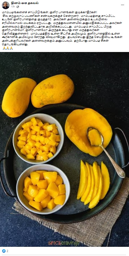 மாம்பழங்களை சாப்பிட்டுவிட்டு குளிர்பானம் குடித்தால் இறப்பு ஏற்படும் என்று பரவுகின்ற தகவல் தவறானது; ஆதாரமின்றி பரவுகிறது என்பது நமக்கு கிடைத்த ஆதாரங்களின் வாயிலாக தெளிவாகியுள்ளது.