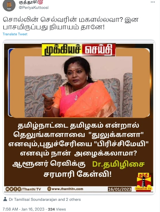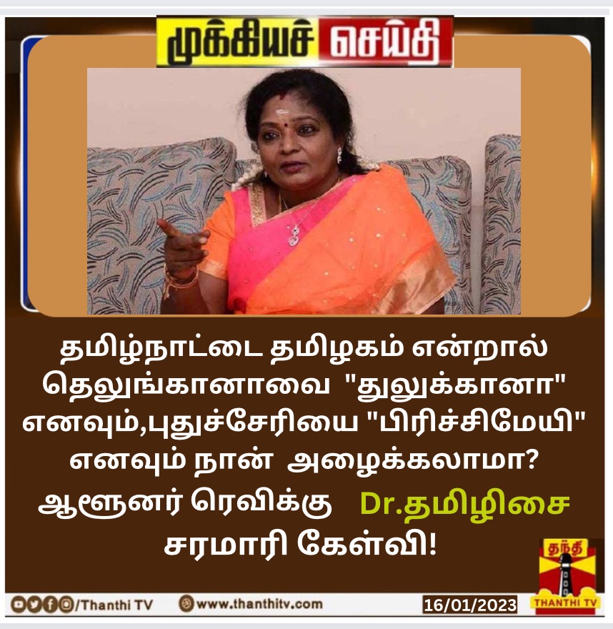 தமிழ்நாட்டை தமிழகம் என்றால் தெலுங்கானாவை ’துலுக்கானா’ எனவும், புதுச்சேரியை ’பிரிச்சிமேயி’ எனவும் நான் அழைக்கலாமா என்று தமிழ்நாடு ஆளுநர் ஆர்.என்.ரவிக்கு தெலுங்கானா ஆளுநர் தமிழிசை செளந்தரராஜன் சரமாரி கேள்வி என்பதாக இந்த நியூஸ்கார்ட் வைரலாகிறது.