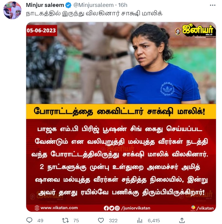 எனவே, சாக்ஷி மாலிக் போராட்டத்தைக் கைவிட்டதாகப் பரவும் தகவல் போலியானது என்று இதன்மூலமாகத் தெளிவாகிறது.