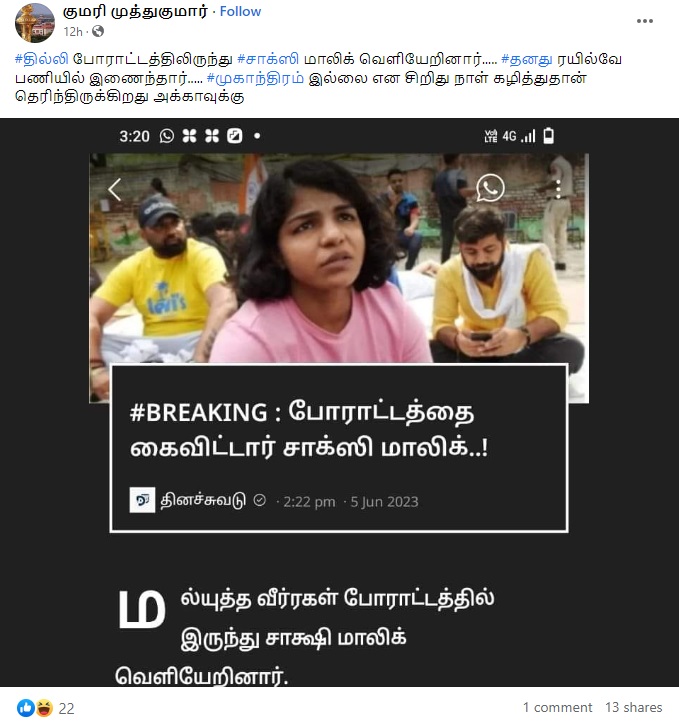 “மல்யுத்த வீரர்கள் போராட்டத்தில் இருந்து விலகிய சாக்ஷி மாலிக் போராட்டத்தை கைவிட்டு வடக்கு ரயில்வேயில் தனது பணியை தொடங்கினார் சாக்ஷி மாலிக்” என்று தந்தி டிவி உள்ளிட்ட ஊடகங்கள் செய்தி வெளியிட்ட நிலையில் அதனை பலரும் சமூக வலைத்தளங்களில் பகிர்ந்து வருகின்றனர்.