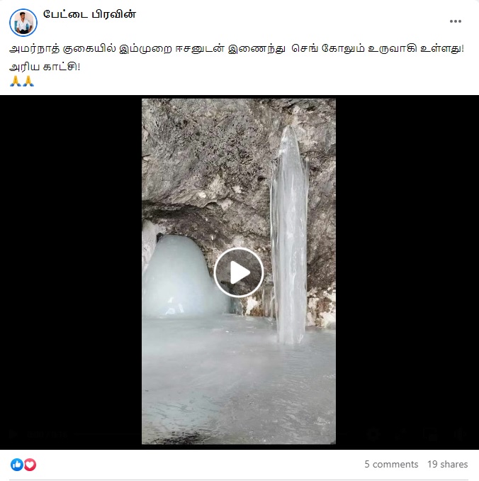 “அமர்நாத் குகையில் இம்முறை ஈசனுடன் இணைந்து செங் கோலும் உருவாகி உள்ளது! அரிய காட்சி” என்று இந்த புகைப்படச் செய்தி பரவி வருகிறது.