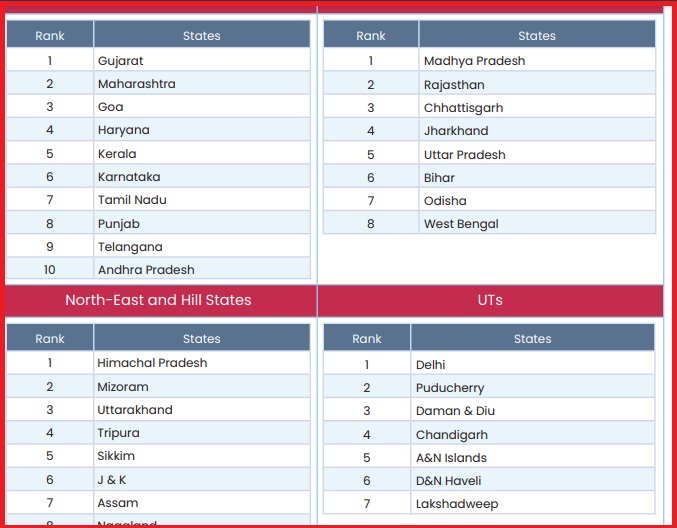 மேலும், குரூப் ஏ, குரூப் பி, வடகிழக்கு மற்றும் மலைப்பகுதி மாநிலங்கள் மற்றும் யூனியன் பிரதேசங்கள் என்று நான்கு பிரிவுகளாக வகைப்படுத்தப்பட்டுள்ள பட்டியலில் குரூப் ஏ பிரிவில் இடம்பெற்று முதலிடத்தைப் பிடித்துள்ளது தமிழ்நாடு.