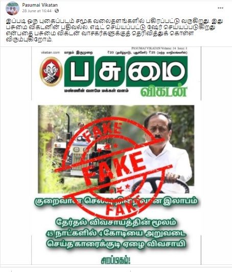 இந்நிலையில், “குறைவான வருமானம் செலவு நிறைவான இலாபம். தேர்தல் விவசாயத்தின் மூலம் 45 நாட்களில் 4 கோடியை அறுவடை செய்த காரைக்குடி ஏழை விவசாயி” என்கிற வகையில் ஹெச்.ராஜா குறித்து அட்டைப்படத்துடன் புகைப்படம் ஒன்று சமூக வலைத்தளங்களில் பசுமை விகடன் வெளியிட்டது போன்று வைரலாகிறது.
