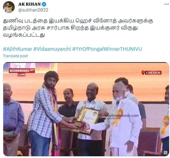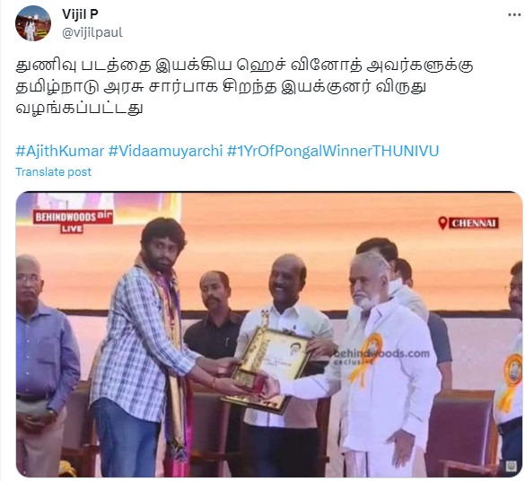 ”துணிவு படத்தை இயக்கிய ஹெச் வினோத் அவர்களுக்கு தமிழ்நாடு அரசு சார்பாக சிறந்த இயக்குனர் விருது வழங்கப்பட்டது ” என்று இந்த புகைப்படம் வைரலாகிறது.