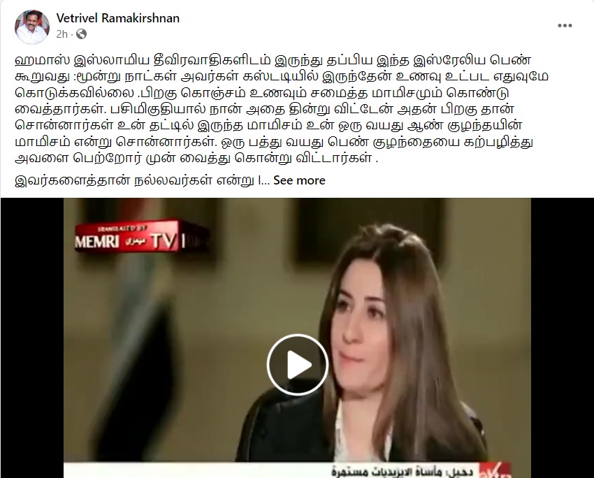 Claim: ஹமாஸ் தீவிரவாதிகளால் கடத்தப்பட்டு சிறு குழந்தையின் மாமிசத்தை சாப்பிட வைக்கப்பட்ட பெண் அளித்த பேட்டி