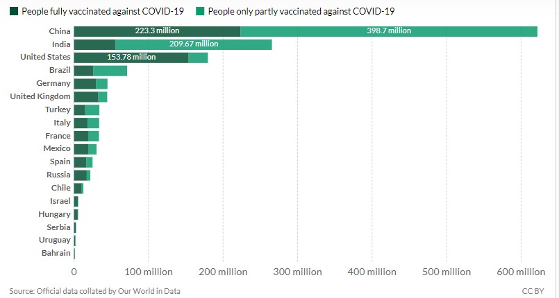 ஆனால் இந்த எண்ணிக்கை உலகத்திலேயே அதிகம் எனும் தகவல் தவறானதாகும். ஏனெனில் சீனாவில் இந்தியாவை விட அதிக எண்ணிக்கையில் தடுப்பூசி போடப்பட்டுள்ளது. சீனாவில் 120 கோடிக்கும் அதிகமான தடுப்பூசிகள் போடப்பட்டுள்ளது.