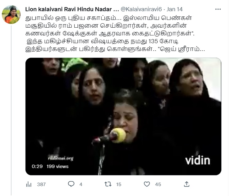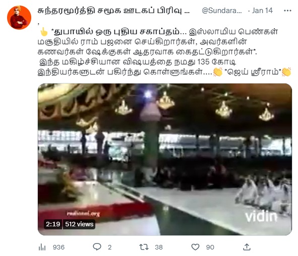 ”துபாயில் ஒரு புதிய சகாப்தம். இஸ்லாமிய பெண்கள் மசூதியில் ராம் பஜனை செய்கிறார்கள், அவர்களின் கணவர்கள் ஷேக்குகள் ஆதரவாக கைதட்டுகிறார்கள். இந்த மகிழ்ச்சியான விஷயத்தை நமது 135 கோடி இந்தியர்களுடன் பகிர்ந்து கொள்ளுங்கள்” என்று அந்த வீடியோ வைரலாகிறது.