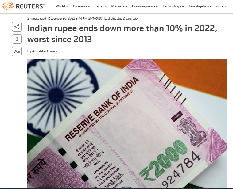 எனினும், அவர்களுடைய முழுமையான செய்திக்கட்டுரையை ஆராய்ந்தபோது அதில், “2022 இறுதியில் இந்திய ரூபாயின் மதிப்பு 10% ஆக முடிவடைந்துள்ளது. இது 2013க்குப் பிறகு மிகவும் மோசமான முடிவாகும்” என்று தெரிவிக்கப்பட்டுள்ளது. மேலும், “10.14% வீழ்ச்சியுடன் 2022ஆம் ஆண்டின் மிக மோசமாக நாணயமாக இந்திய கரன்சி முடிவடைந்துள்ளது” என்றும் தெரிவிக்கப்பட்டுள்ளது.