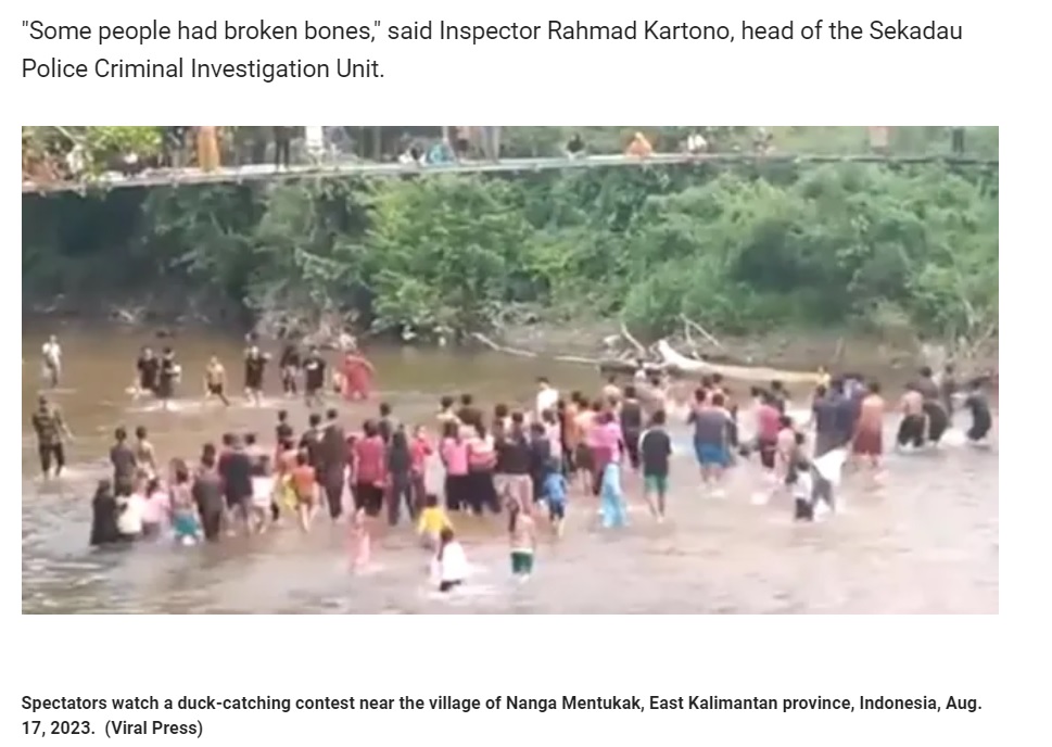 இந்தோனேசியாவின் Nanga Mentukak கிராமத்தில் கடந்த ஆகஸ்ட் 17ஆம் தேதியன்று சுதந்திர தினத்தை முன்னிட்டு ஆற்றில் வாத்து பிடிக்கும் போட்டியின் போது, ஆற்றின் மேலுள்ள தொங்கு பாலம் கீழே விழுந்து விபத்தானதில் 32 பேர் காயமடைந்தனர் என்று பல்வேறு இந்தோனேசிய ஊடகங்களிலும் செய்தி வெளியாகியுள்ளது.