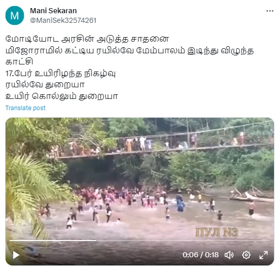 “மோடியோட அரசின் அடுத்த சாதனை. மிசோரமில் கட்டிய ரயில்வே மேம்பாலம் இடிந்து விழுந்த காட்சி. 17 பேர் உயிரிழந்த நிகழ்வு. ரயில்வே துறையா உயிர் கொல்லும் துறையா” என்று இந்த வீடியோ பரவி வருகிறது.