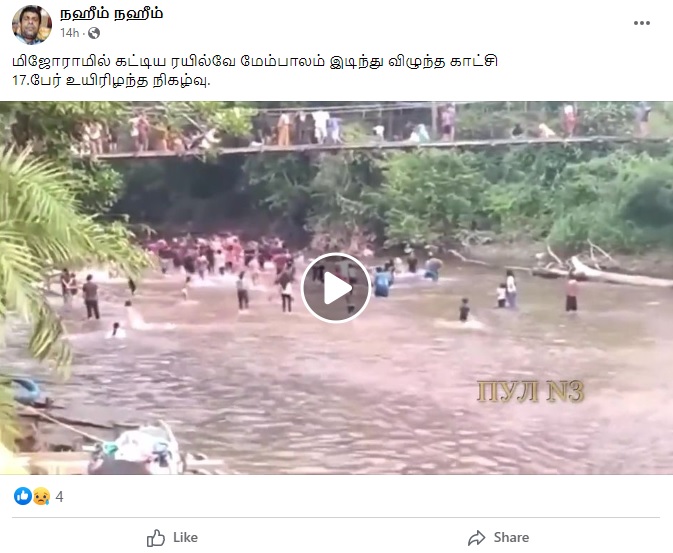 மிசோரமில் ரயில்வே பாலம் இடிந்து விழுந்த காட்சி என்று வீடியோ ஒன்று சமூக வலைத்தளங்களில் பரவி வருகிறது.