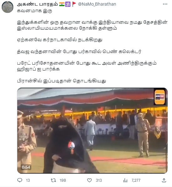 “கவனமாக இரு. இந்துக்களின் ஒரு தவறான வாக்கு இந்தியாவை நமது தேசத்தின் இஸ்லாமியமயமாக்கலை நோக்கி தள்ளும் ஏற்கனவே கர்நாடகாவில் நடக்கிறது த்வஜ வந்தனாவின் போது பர்காவில் பெண் கலெக்டர் பரேட் பரிசோதனையின் போது கூட அவள் அணிந்திருக்கும் ஹிஜாப் ஐ பார்க்க. பிரான்சில் இப்படிதான் தொடங்கியது” என்று இந்த வீடியோ வைரலாகிறது.