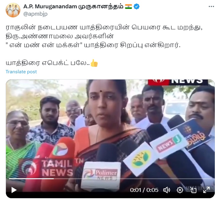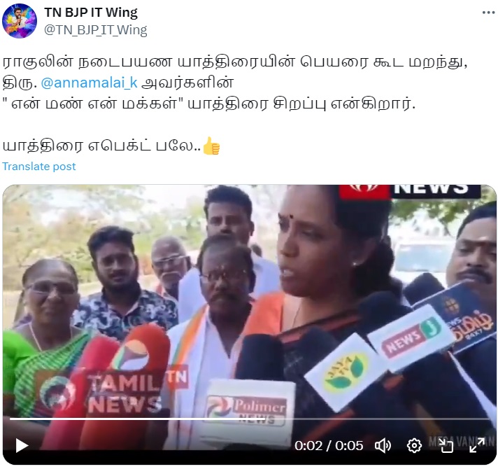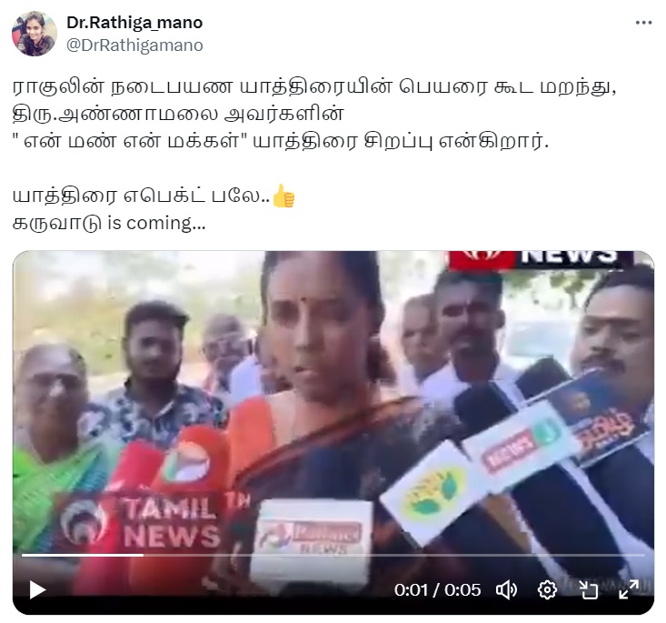 ”ராகுலின் நடைபயண யாத்திரையின் பெயரை கூட மறந்து, திரு.அண்ணாமலை அவர்களின்” என் மண் என் மக்கள்” யாத்திரை சிறப்பு என்கிறார். யாத்திரை எபெக்ட் பலே..” என்று இந்த வீடியோ வைரலாகிறது.
