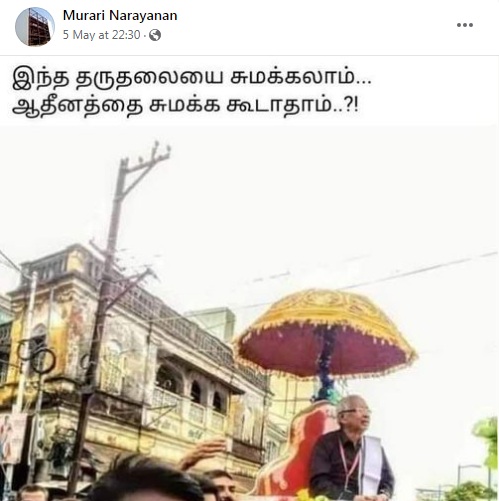 இந்நிலையில், ”இந்த தருதலையை சுமக்கலாம். ஆதீனத்தை சுமக்க கூடாதாம்?” என்பதாக திராவிடக் கழகத் தலைவர் கி.வீரமணியை தொண்டர்கள் சிலர் பல்லக்கில் வைத்து சுமப்பது போன்ற புகைப்படம் ஒன்று சமூக வலைத்தளங்களில் வைரலாகிறது.