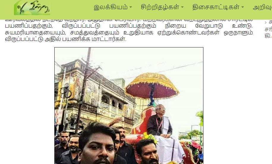 திராவிடர் கழகத் தலைவர் கி.வீரமணியை பல்லக்கில் சுமந்து சென்றதாக பரவுகின்ற புகைப்படத் தகவல் குறித்த உண்மையறிய அதுகுறித்த ஆய்வில் ஈடுபட்டோம்.