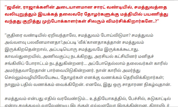 “சாரட் வண்டிகள் ஒரு நாள் வரலாற்றின் குப்பைத் தொட்டிக்குப் போய்விடும். நம் கொள்கைகளை ஏற்றுக் கொண்டு நம் பின்னால் அணிதிரண்டவர்கள், அடுத்த தலைமுறைக்கு சுயமரியாதையையும், பகுத்தறிவையும் எடுத்துச் செல்ல வேண்டும் என்று விரும்பினால் பரவாயில்லை.” என்பதாக அக்கட்டுரையில் தெரிவிக்கப்பட்டுள்ளது.