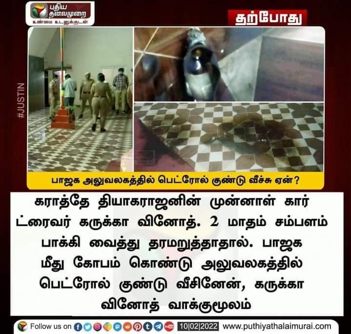 இந்நிலையில் இச்சம்பவத்தில் தொடர்புடையவர் என்று கைது செய்யப்பட்ட கருக்கா வினோத் கராத்தே தியாகராஜனின் முன்னாள் டிரைவர் என்றும், இரண்டு மாத சம்பள பாக்கியை தர மறுத்ததால் கோபம் கொண்டு பாஜக அலுவலகத்தில் குண்டு வீசினேன் என்று கருக்கா வினோத் வாக்குமூலம் கொடுத்ததாகவும் நியூஸ்கார்ட் ஒன்று சமூக ஊடகங்களில் வைரலாகி வருகின்றது.