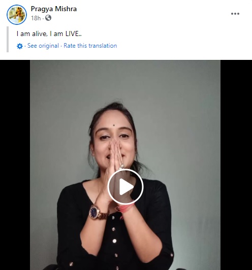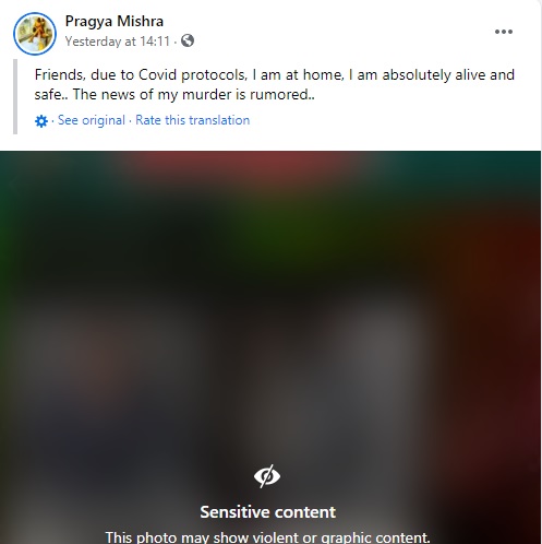மேலும், பத்திரிக்கையாளர் பிரக்யா மிஸ்ராவே இந்த வைரல் வீடியோ குறித்து விளக்கமளித்துள்ளார். தான் கோவிட் கட்டுப்பாடுகள் காரணமாக வீட்டில் தனிமைப்படுத்திக் கொண்டு இருப்பதாகவும், தான் மிகவும் பத்திரமாக இருப்பதாகவும், தான் கொலை செய்யப்பட்டதாகப் பரவும் புகைப்படம் மற்றும் வீடியோ செய்தி வதந்தி என்றும் தெரிவித்துள்ளார்.