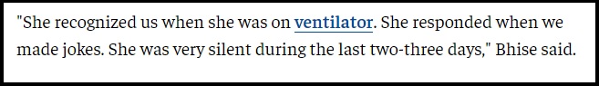 கொரோனாவால் பாதிக்கப்பட்டு மும்பை ப்ரீச் கேண்டி மருத்துவமனையில் அனுமதிக்கப்பட்டிருந்த லதா மங்கேஷ்கர், தனது கடைசி நாட்களில் மிக அமைதியாக இருந்ததாக எக்னாமிக் டைம்ஸ் இதழில் அவரை கவனித்துக் கொண்ட செவிலி தெரிவித்துள்ளார். மேலும், நுரையீரல் பாதிப்பினால் லதா மங்கேஷ்கர் வெண்டிலேட்டரில் இருந்தார் என்பதும் குறிப்பிடத்தக்கது.