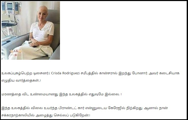 தொடர்ந்து, அவரது இறுதி வார்த்தைகள் என்று பரவுகின்ற வாசகங்களை கீவேர்ட் சர்ச் மூலமாக தேடியபோது, கடந்த சில ஆண்டுகளாகவே குறிப்பிட்ட பதிவு கேன்சரால் இறந்து போன பிரபல பேஷன் ப்ளாகர் Kyrzayda Rodriguez-ன் வார்த்தைகள் என்பதாக பரவி வருவது நமக்குத் தெரிய வந்தது. அவை சமீபத்தில் பகிரப்பட்ட பதிவுகள் அல்ல.