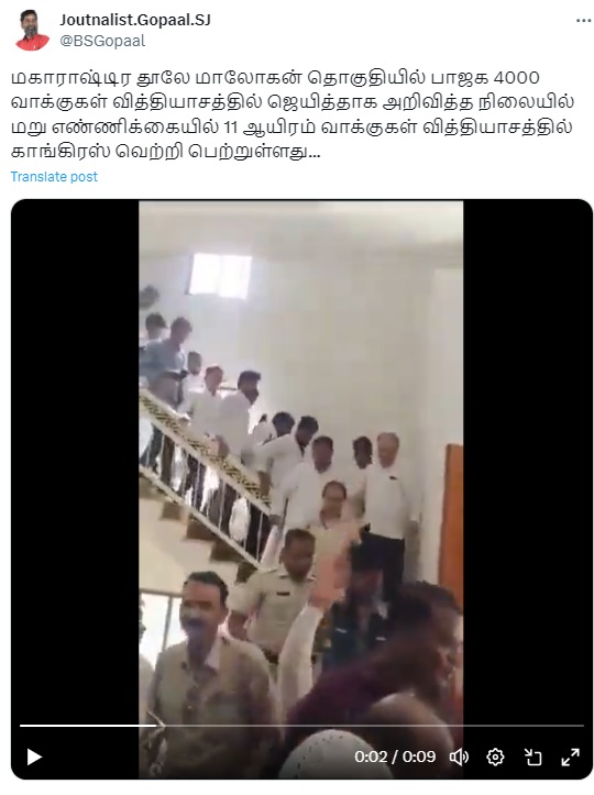 “மகாராஷ்டிர தூலே மாலோகன் தொகுதியில் பாஜக 4000 வாக்குகள் வித்தியாசத்தில் ஜெயித்தாக அறிவித்த நிலையில் மறு எண்ணிக்கையில் 11 ஆயிரம் வாக்குகள் வித்தியாசத்தில் காங்கிரஸ் வெற்றி பெற்றுள்ளது” என்று இந்த செய்தி பரவுகிறது.