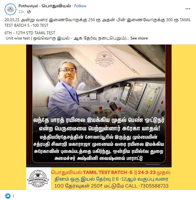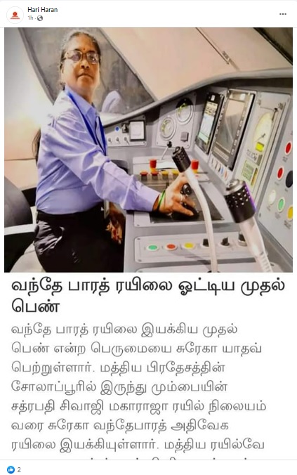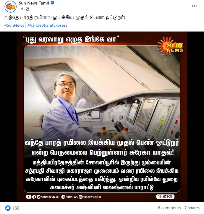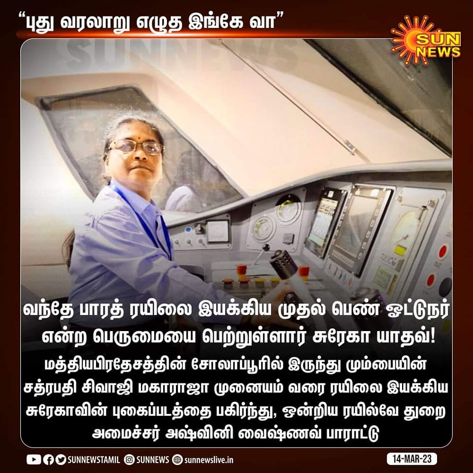 ”வந்தே பாரத் ரயிலை இயக்கிய முதல் பெண் ஓட்டுநர் என்ற பெருமையை பெற்றுள்ளார் சுரேகா யாதவ்! மத்தியபிரதேசத்தின் சோலாப்பூரில் இருந்து மும்பையின் சத்ரபதி சிவாஜி மகாராஜா முனையம் வரை ரயிலை இயக்கிய சுரேகாவின் புகைப்படத்தைப் பகிர்ந்து ஒன்றிய ரயில்வே துறை அமைச்சர் அஷ்வினி வைஷ்ணவ் பாராட்டு” என்று செய்தி வெளியிட்டுள்ளது சன் நியூஸ். இதனைப் பலரும் பகிர்ந்த் வருகின்றனர்.