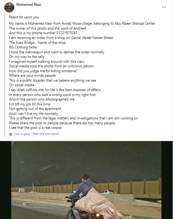 நம்முடைய தொடர் தேடுதலில், கடந்த ஜூன் 1ஆம் தேதியன்று வெளியான ஃபேஸ்புக் பதிவு ஒன்று கிடைத்தது. முகமது நசர் என்கிற நபர் அப்பதிவில், புகைப்படத்தில் பொம்மையை எடுத்துச் செல்லும் நபர் தானேதான் என்றும், தன் மீது தவறாக உயிரிழந்த உடலை எடுத்துச் சென்றதாக செய்தி பரவுவதாகவும் தெரிவித்துள்ளார்.
