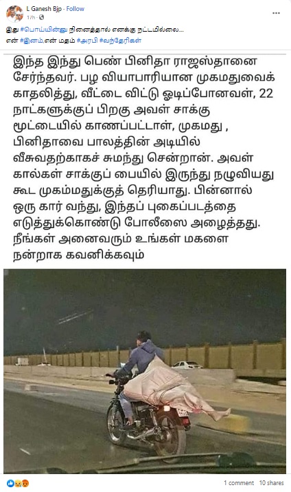“இந்த இந்து பெண் பினிதா ராஜஸ்தானை சேர்ந்தவர். பழ வியாபாரியான முகமதுவைக் காதலித்து, வீட்டை விட்டு ஓடிப்போனவள், 22 நாட்களுக்குப் பிறகு அவள் சாக்கு மூட்டையில் காணப்பட்டாள், முகமது, பினிதாவை பாலத்தின் அடியில் வீசுவதற்காகச் சுமந்து சென்றான். அவள் கால்கள் சாக்குப் பையில் இருந்து நழுவியது கூட முகம்மதுக்குத் தெரியாது. பின்னால் ஒரு கார் வந்து, இந்தப் புகைப்படத்தை எடுத்துக்கொண்டு போலீஸை அழைத்தது. நீங்கள் அனைவரும் உங்கள் மகளை நன்றாக கவனிக்கவும்” என்கிற பதிவுடன் இப்புகைப்படம் பரவி வருகிறது.