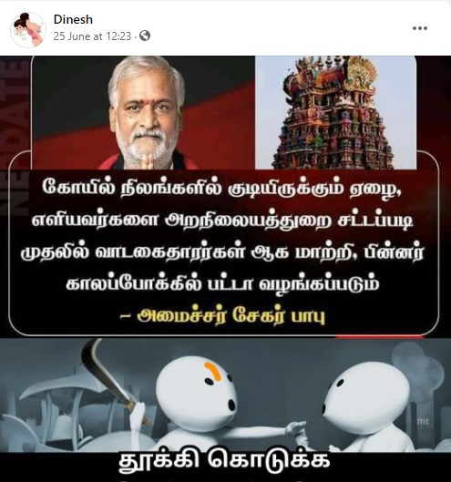 இந்நிலையில், “கோயில் நிலங்களில் குடியிருக்கும் ஏழை, எளியவர்களுக்கு அறநிலையத்துறை சட்டப்படி முதலில் வாடகைதாரர்கள் ஆக மாற்றி, பின்னர் காலப்போக்கில் பட்டா வழங்கப்படும்” என்று அமைச்சர் சேகர் பாபு பேசியதாக செய்தி ஒன்று சமூக வலைத்தளங்களில் வைரலாகிறது.