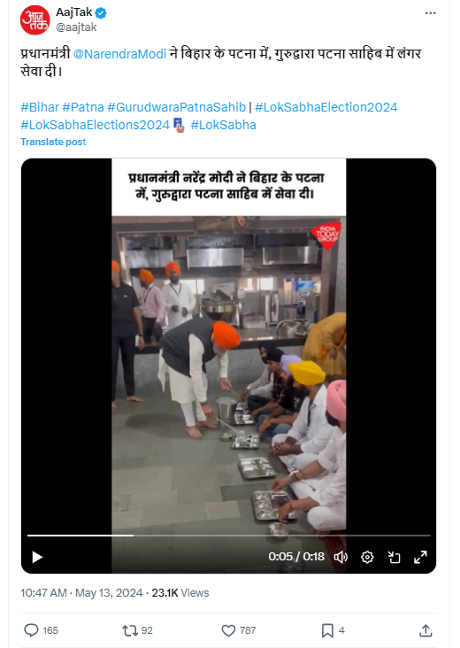 வைரலாகும் புகைப்படத்தை கூகுள் ரிவர்ஸ் சர்ச் மூலமாக தேடியபோது மே 13, 2024 அன்று Aaj Tak வெளியிட்டிருந்த பிரதமர் மோடி குருத்வாராவில் உணவு பரிமாறும் வீடியோ கிடைத்தது.